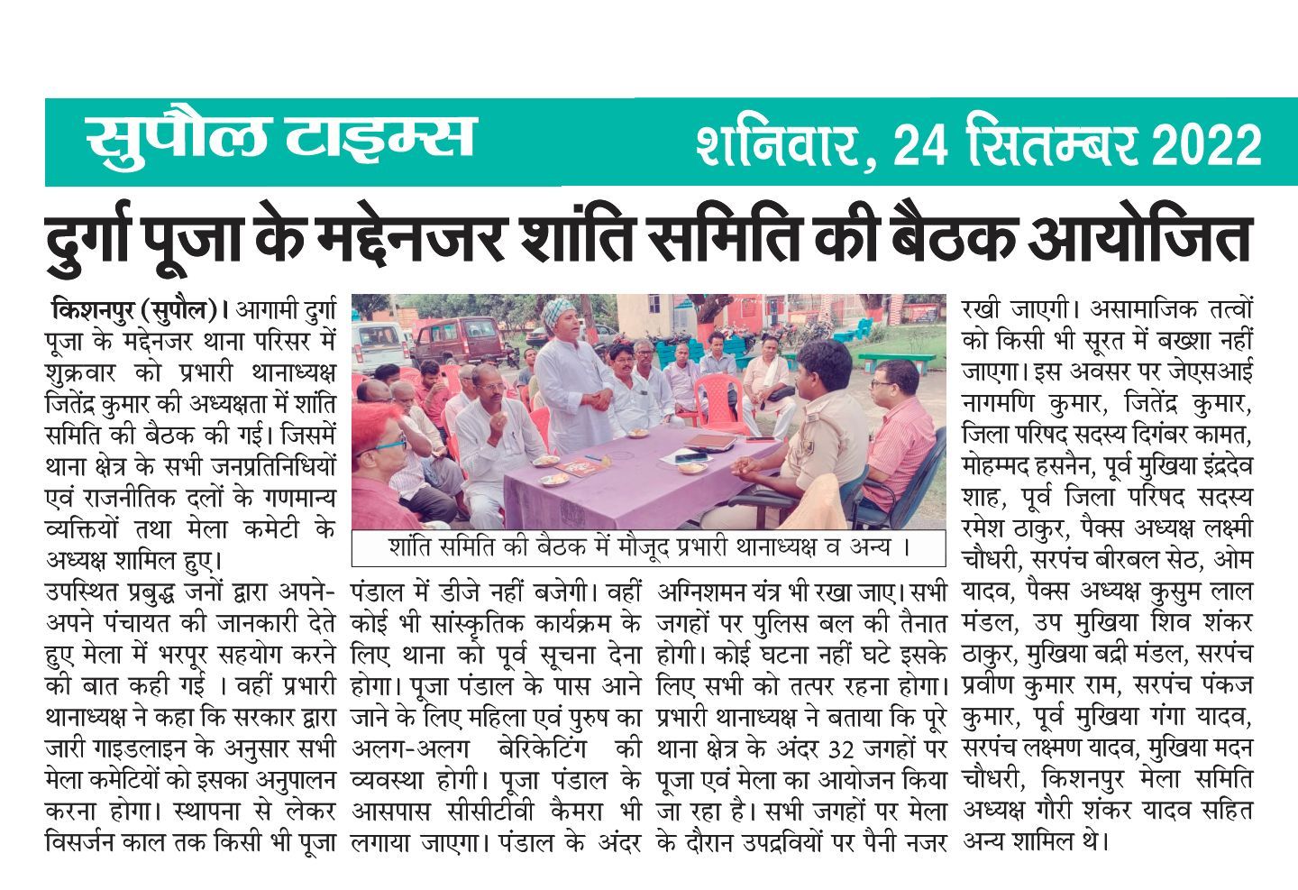 किशनपुर (सुपौल)। आगामी दुर्गा पूजा के मद्देनजर थाना परिसर में शुक्रवार को प्रभारी थानाध्यक्ष जितेंद्र कुमार की अध्यक्षता में शांति समिति की बैठक की गई। जिसमें थाना क्षेत्र के सभी जनप्रतिनिधियों एवं राजनीतिक दलों के गणमान्य व्यक्तियों तथा मेला कमेटी के अध्यक्ष शामिल हुए।