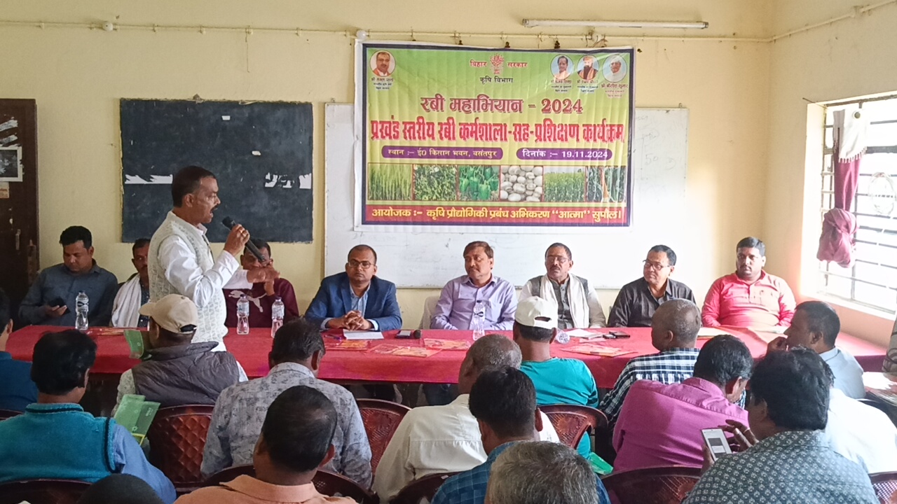 सुपौल। बसंतपुर स्थित ई किसान भवन में मंगलवार को अनुमंडल कृषि पदाधिकारी कुंदन कुमार की अध्यक्षता में रबी महा-अभियान 2024 के तहत प्रखंड स्तरीय रबी कर्मशाला सह प्रशिक्षण कार्यक्रम का आयोजन किया गया। इस कार्यक्रम का उद्घाटन उप परियोजना निदेशक आत्मा चंद्र आलोक कुमार, प्रखंड कृषि पदाधिकारी सुधाकर पाण्डेय, भाजपा के पूर्वी प्रभाग के मंडल अध्यक्ष आशीष देव, पश्चिमी प्रभाग के मंडल अध्यक्ष पवन मेहता, व्यापार मंडल अध्यक्ष श्रीलाल गोठिया और अन्य गणमान्य व्यक्तियों ने दीप प्रज्वलित कर किया।